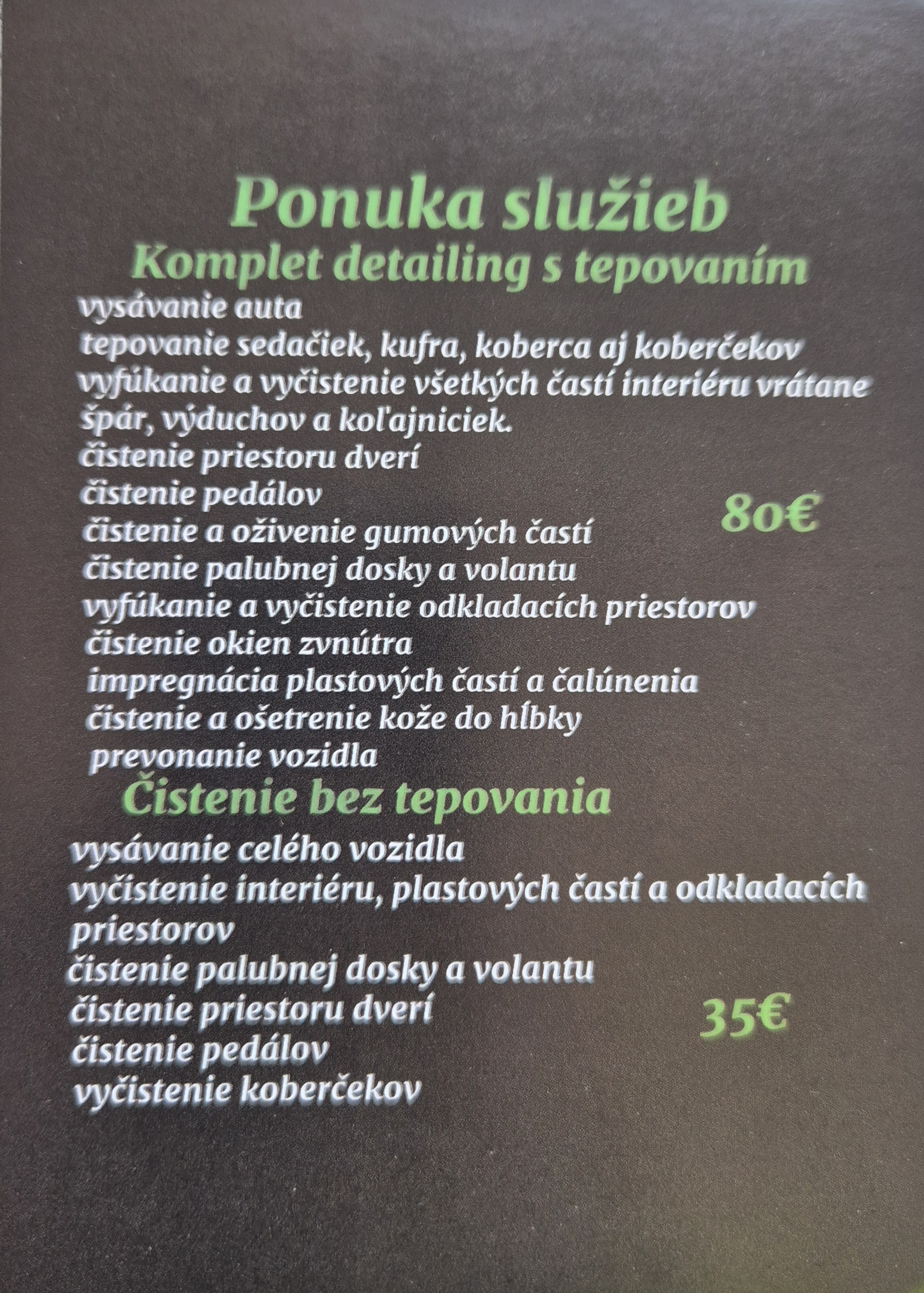 Okrem kvalitných kamenárskych prác vám teraz prinášame aj čistenie interiéru vozidiel Doprajte svojmu autu sviežosť, čistotu a nový vzhľad Odstránime nečistoty, škvrny aj nepríjemné pachy Starostlivosť o sedačky, koberce aj plastové časti AKCIA Využite otváraciu zľavu -10€ na kompletný detailing interiéru s tepovaním Objednajte sa ešte dnes a presvedčte sa